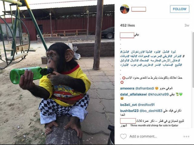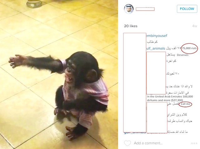 Unashamedly flaunting his illegal wildlife trafficking activities on social media, the man offered the frightened young chimpanzee for 75,000 Qatar rials (about USD 20,600). There were likes and multiple comments on his video, including one from a potential buyer, who asked the dealer to call him. It seems the transaction never went through, as the same chimp was advertised for sale on a well-known Kuwaiti traffickers social media about ten days later.