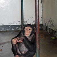 Akeela, a victim of the wildlife trade, was kept in a small cage in an